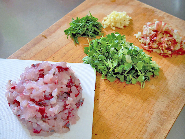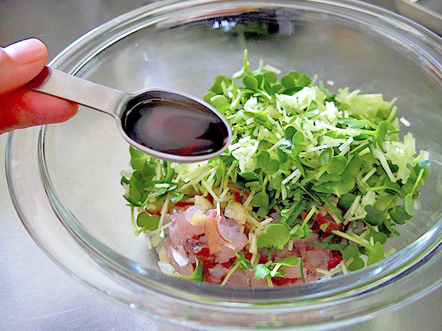 2.ボウルにみじん切りした材料を入れ、うどんだしの素を加えて和える。 (そのままお酒のあてに、またご飯にのせて。)