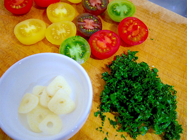 2.パセリは葉の部分をみじん切りにし、にんにくはスライス、ミニトマトは半分に切っておく。