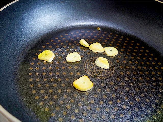 3.フライパンにオリーブオイルとにんにくを入れ火にかけ、にんにくがきつね色に色付いたらにんにくだけ取り出す。