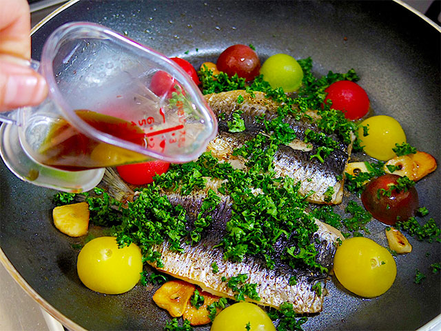 5.焼きあがり前に、にんにくを戻し、ミニトマト、パセリ、うどんだしの素を加えて焼いたらできあがり。