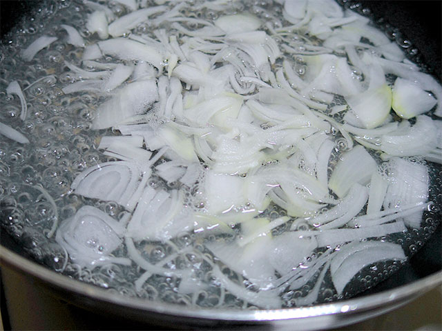 2.フライパンに200mlのお湯を沸かしたところに、スライスした玉ねぎを入れる。