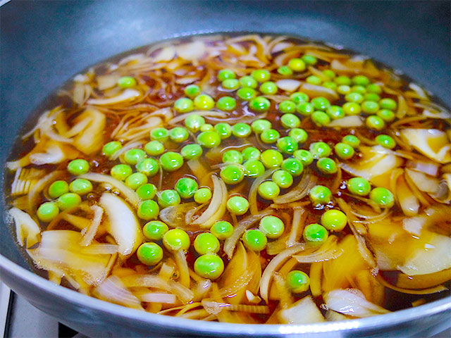 3.そばつゆの素を加え、玉ねぎがやわらかくなるまで煮、