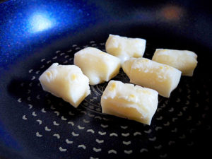 1.餅を3等分にし、フライパンで焼く。