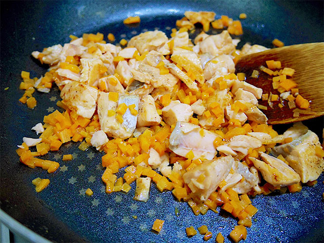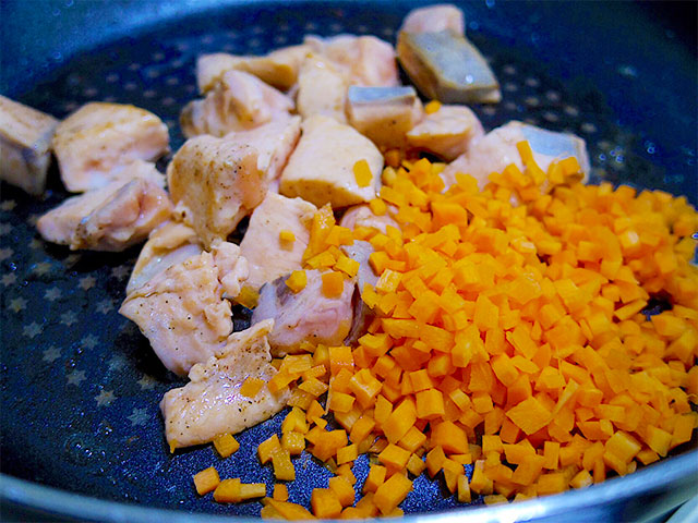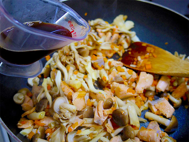 4.鮭全体の色が変わってきたら、人参を加えて炒め合わせます。