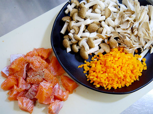 2.鮭はサッと水で洗い、水気を拭き取り、皮と骨を取り除き、