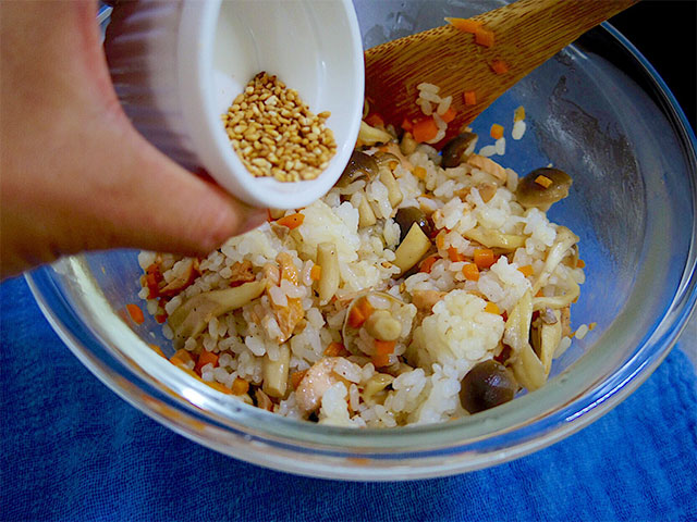 7.炊きたてのご飯の中に炒めた具材と胡麻を加えて混ぜます。