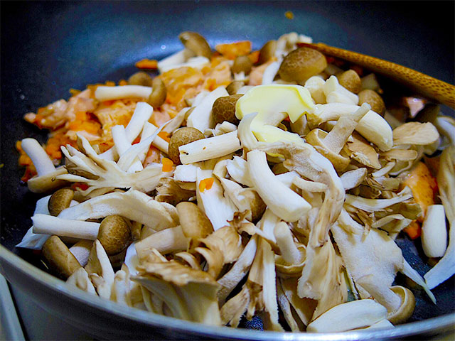 5.人参が少し透き通ってきたら、きのこを加えて残りのバターも加えて炒めます。