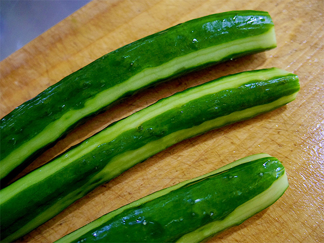 1.きゅうりを洗って塩(分量外)をふって板ずりをする。
