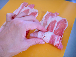 2.豚バラ肉2枚~3枚分を重ね手前からくるくると巻いていく。同様の作業を繰り返し、巻いていく。