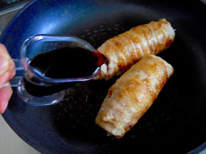 4.焼き目がついたら酒とそばつゆの素を加えてフライパンに蓋をして弱火で10分程蒸し焼きにする。