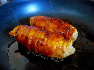 3.片栗粉をまぶしたらフライパンに油をひき、肉の巻き終わりを下にして焼いていく。