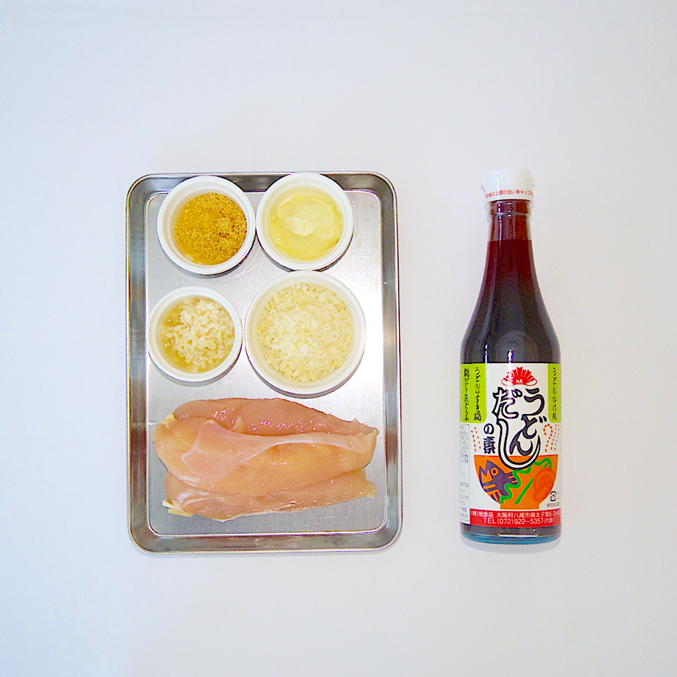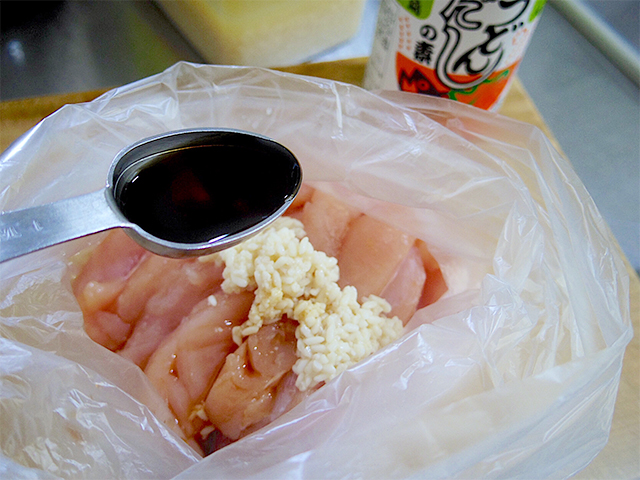 2.ビニール袋にささみ、砂糖、塩麹、うどんだしの素を入れてよくもみ込む。
