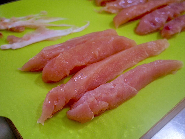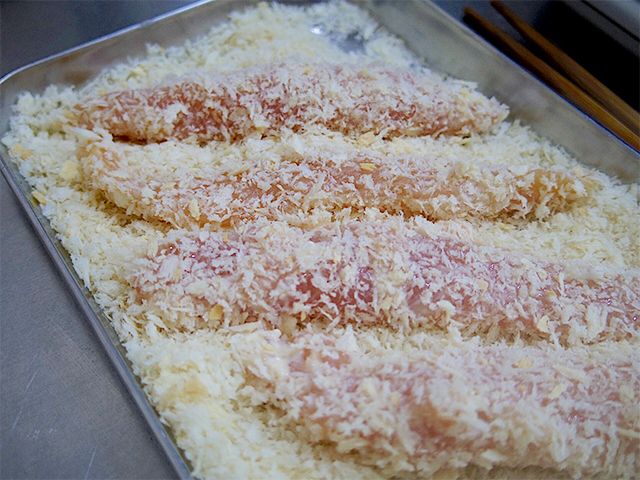 5.バットにパン粉をひいて、ささみにパン粉をつける。