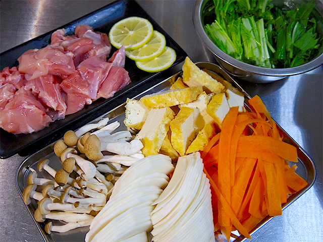 水菜は3~4cm程の長さに切り、しめじは石づきを取り、厚揚げも食べやすい大きさに切っておきます。