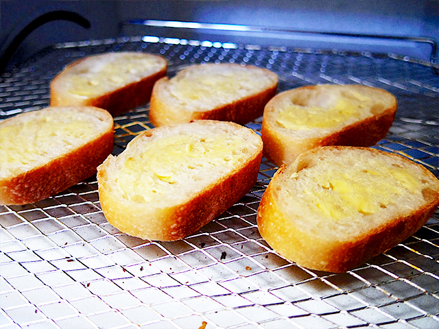 2.バゲットを1cm程の薄切りにし、バターを塗ってトースターで焼く。