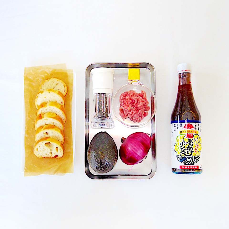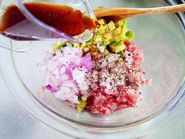 3.カットした紫玉ねぎとアボカドにまぐろ、ブラックペッパー、旭ぶっかけポンズを混ぜ合わせタルタルに。