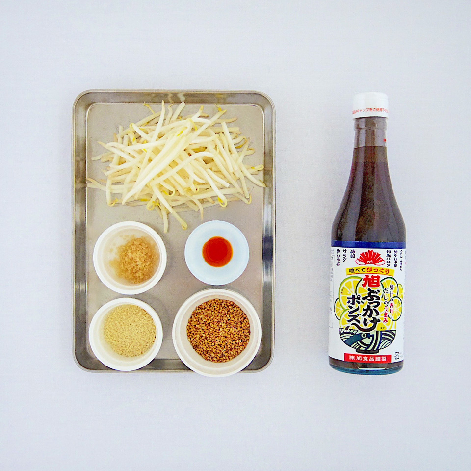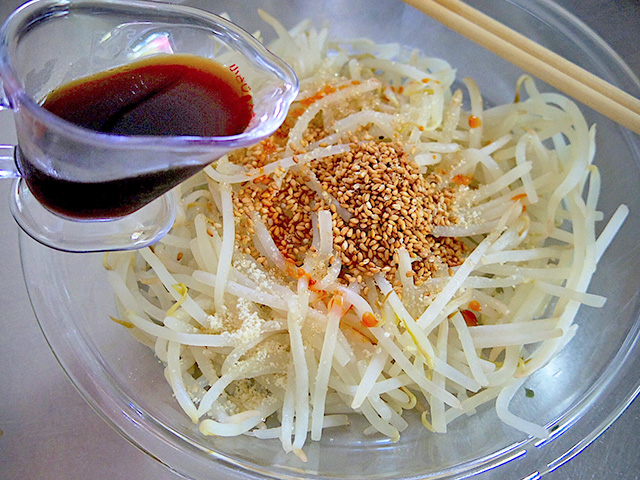3.もやしが温かいうちに*印を加えて和えたらできあがり。