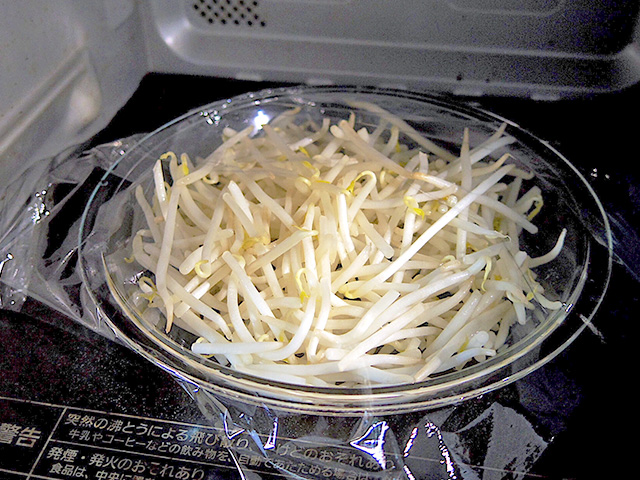 1.もやしは耐熱容器に入れ軽くラップをして、500wで3分加熱する。