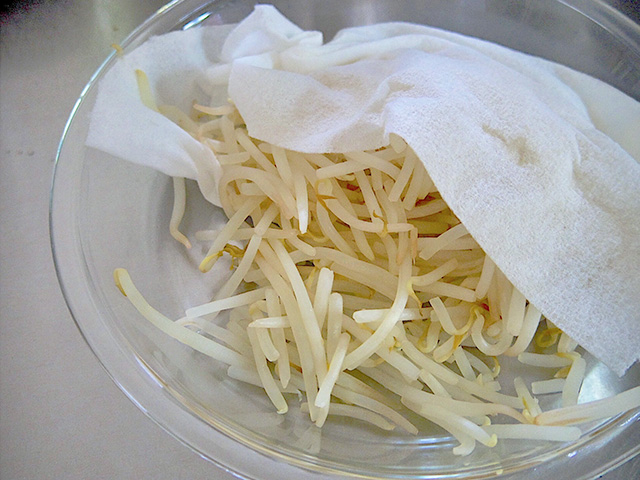 2.もやしから出た水分をキッチンペーパーなどで拭き取る。(火傷に注意)