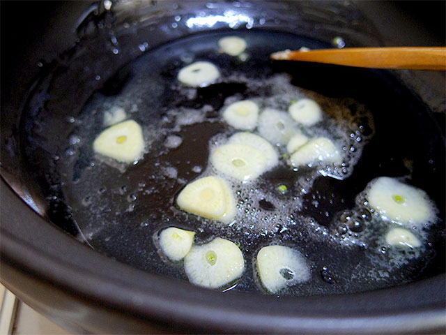 2.鍋にバター半量を入れて、ニンニクを香りが立つまで炒める。