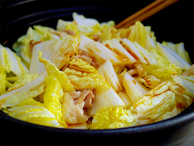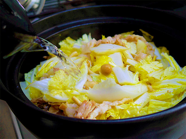 3. 次に豚バラを入れ焼き目がつくまで焼いたら、しめじ、白菜を加えてサッと炒める。