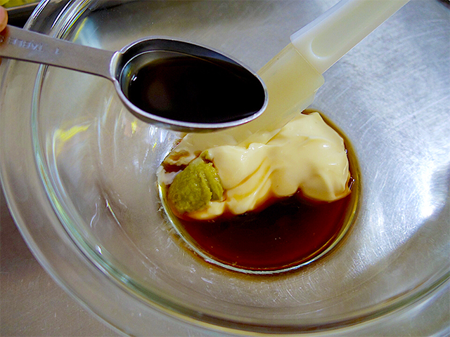 4.ボウルにマヨネーズ、旭ポンズ、わさびを混ぜ合わせる。