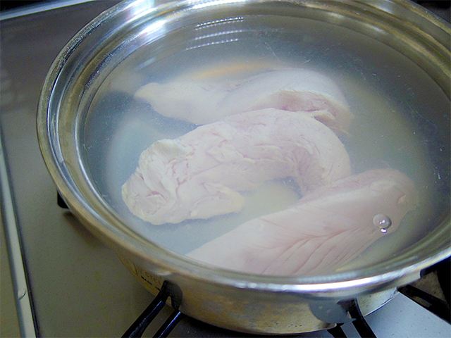 1.500mlほどのお湯を鍋に沸かし、お酒と塩、ささみを入れる。