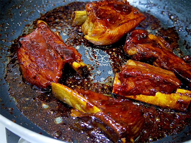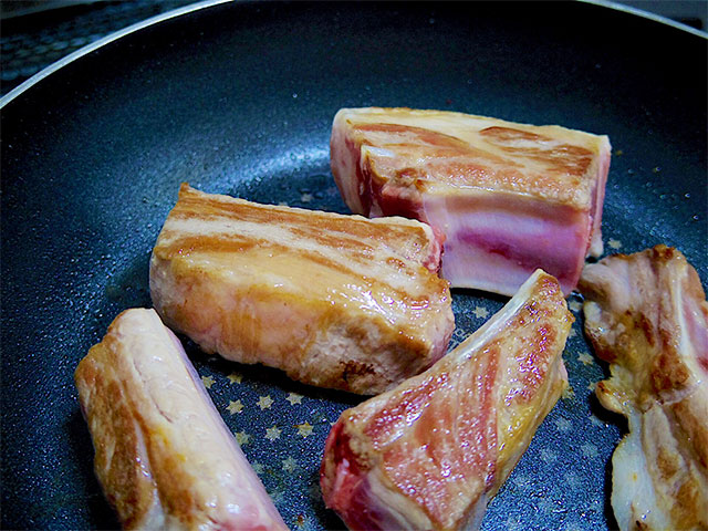 1.スペアリブをフライパンで焼き目がつくまで焼く。