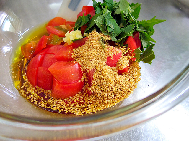 トマトは1cm角ぐらいの大きさにカット、 ニンニクはすりおろし、胡麻も粗めにすり*印以外の材料全てをボウルに入れ混ぜ合わせます。