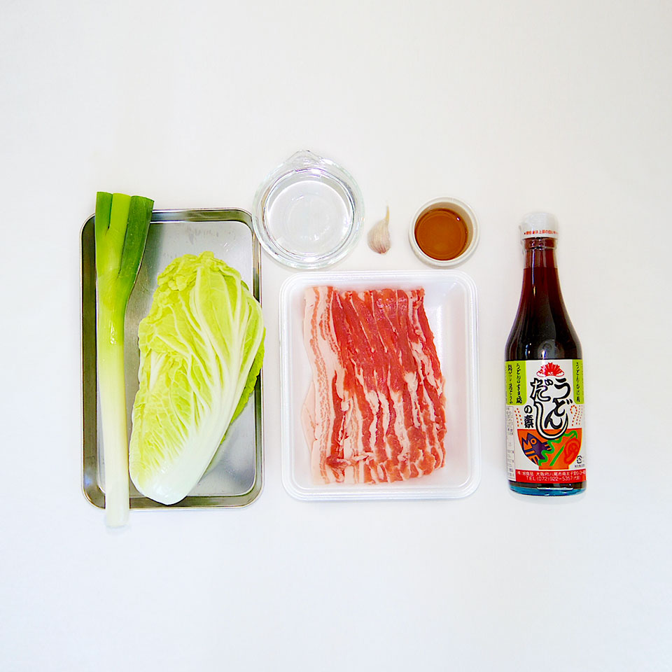 3.鍋に詰めて最後に白ネギを上に乗せ、水とうどんだしの素を加えて煮ていく。