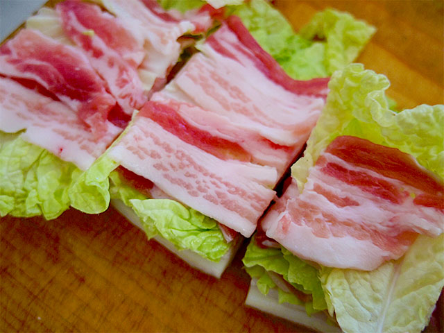 1.白菜を1枚ずつはがしてよく洗って水気を切り、白菜と豚バラ肉を交互に重ねていく。