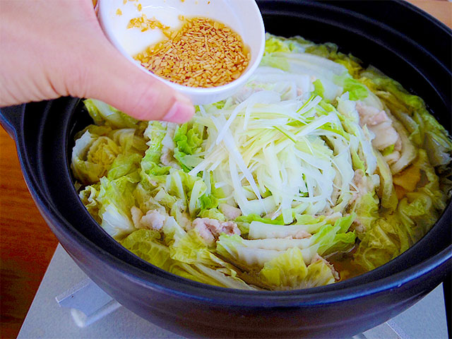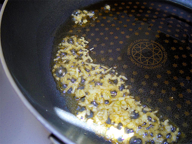 4.お鍋ができあがる直前に、みじん切りにしたニンニクと胡麻油をフライパンに入れて火を入れます。