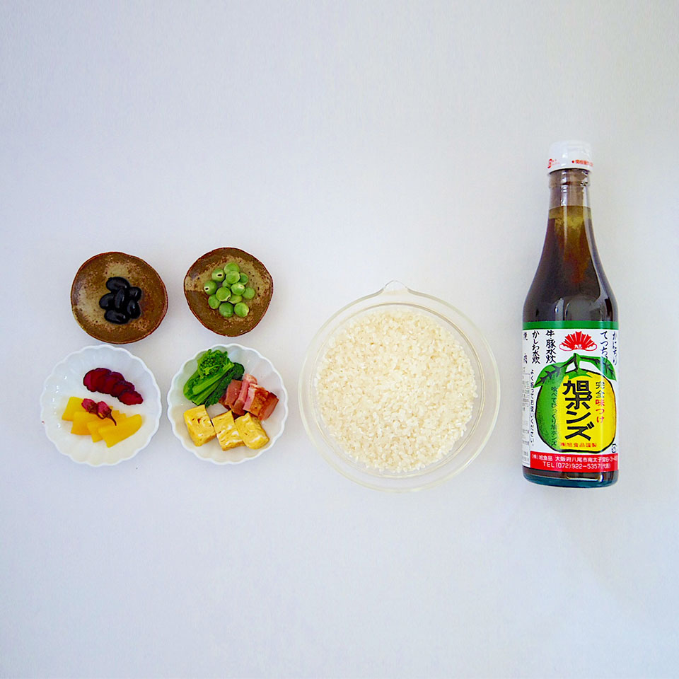 1.米は洗い、水(大さじ2杯分の水の量をひいて)炊飯器にセットし、大さじ2杯の旭ポンズを加えてご飯を炊く。