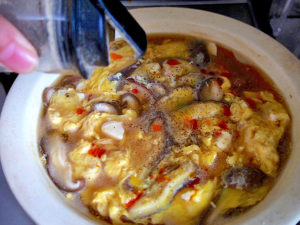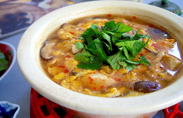 4.煮たったところに水溶き片栗粉を加え、とろみがついたら溶き卵を流し入れる。