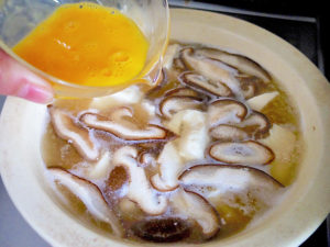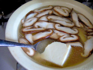2.豆腐丸ごととスライスした椎茸を鍋に入れる。