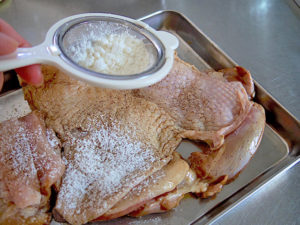 3.鶏肉に塩胡椒をし、薄く小麦粉をつける。