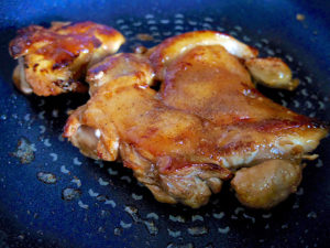 裏返して弱火にし(5分程)、鶏肉に火が通るまで焼く。