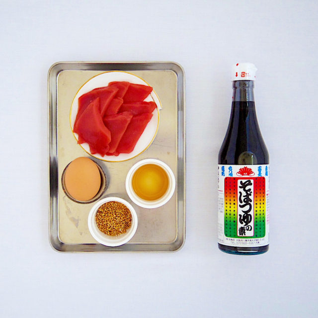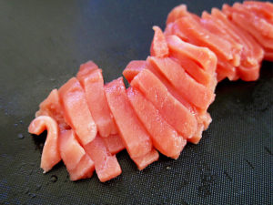 1.マグロの刺身を5mm幅の短冊切りにする。