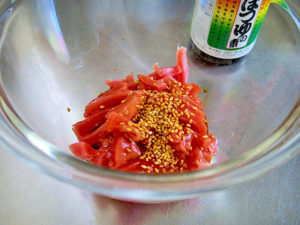 2.マグロ、そばつゆの素、胡麻油、ごまを混ぜ合わせる。