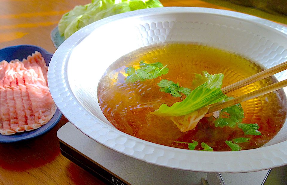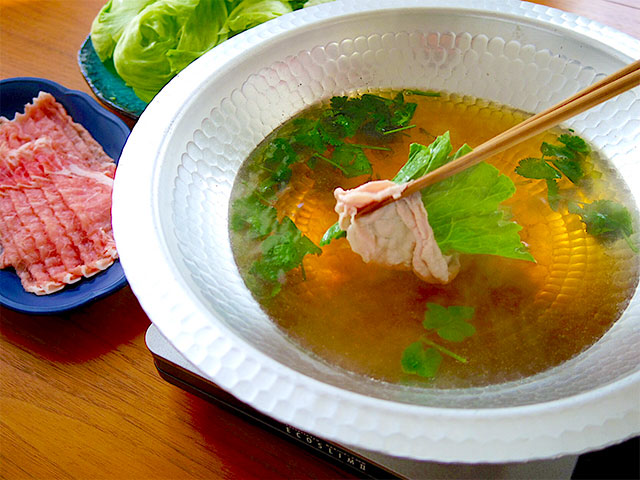 3. お鍋の中にパクチー(適量)を入れ、レタスと豚肉をしゃぶしゃぶしたらスイートチリソースをつけてできあがり。