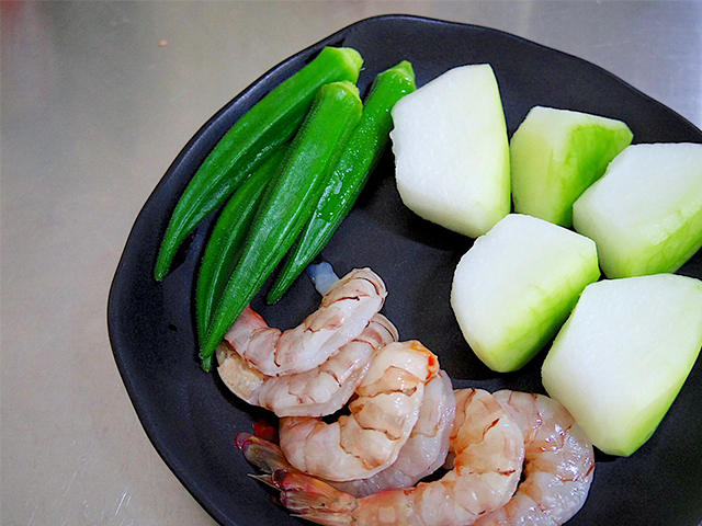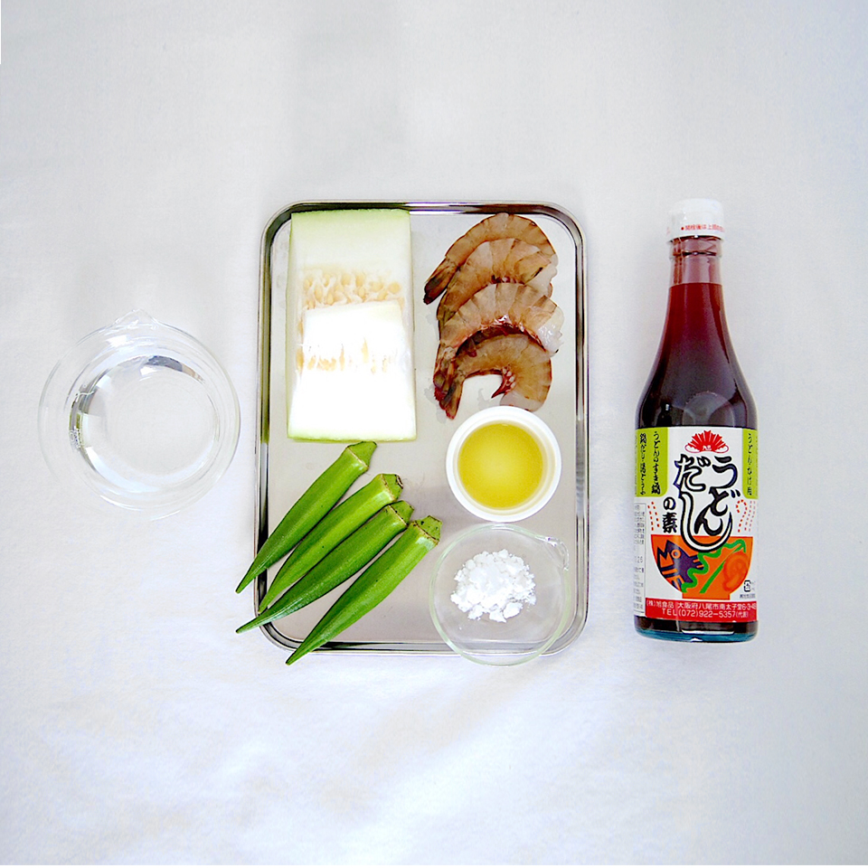 1.冬瓜はワタを取り皮をむき、海老は殻をむき背わたを取り除き、オクラは下ゆでしておく。