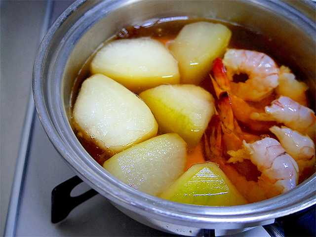 3.再び火を入れ、5分程煮てから海老を加える。