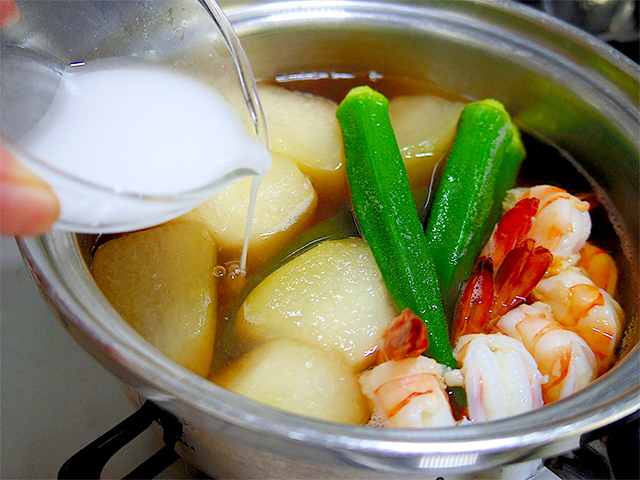 4.海老に火が通ったらオクラも加えて水溶き片栗粉(水は小2程)を入れ、