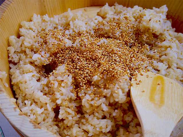 4.炊き上がったお米を桶かボウルに移し替えて、大さじ1の旭ぶっかけポンズをさらに加え、