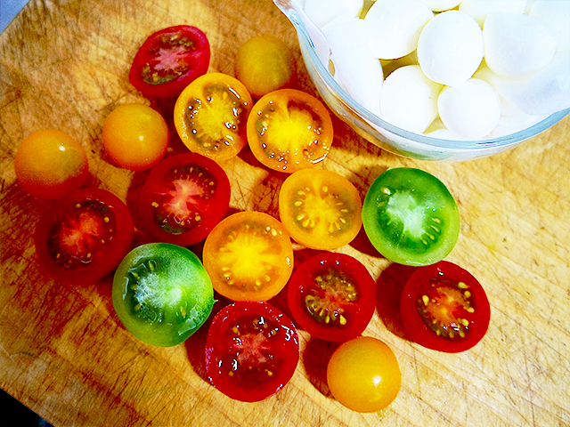 1.ミニトマトを半分に切る。