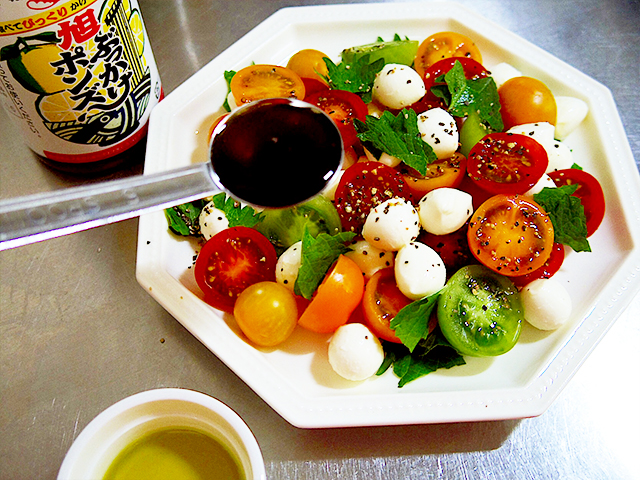 3.旭ぶっかけポンズとオリーブオイルをかけ、ブラックペッパーをかけたらできあがり。