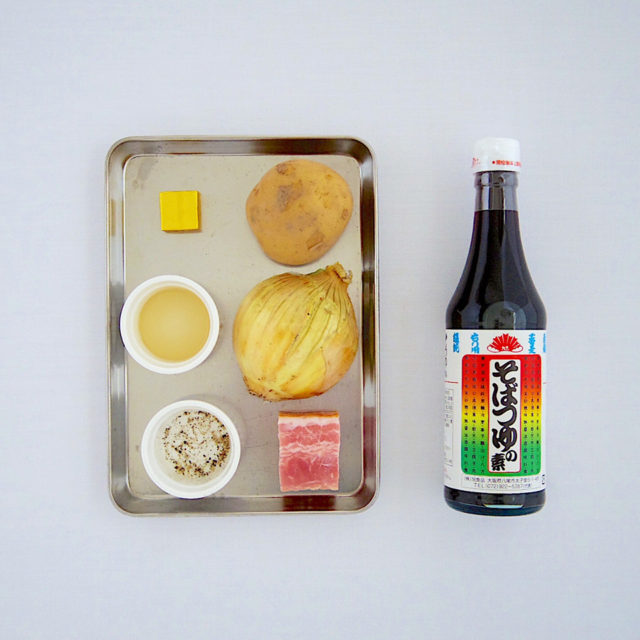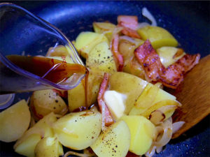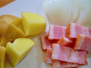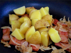 3.熱したフライパンにオリーブオイルとベーコンを入れ焼き目をつけたら、玉ねぎを加えしんなりするまで炒め、最後にじゃがいもを加えて炒める。