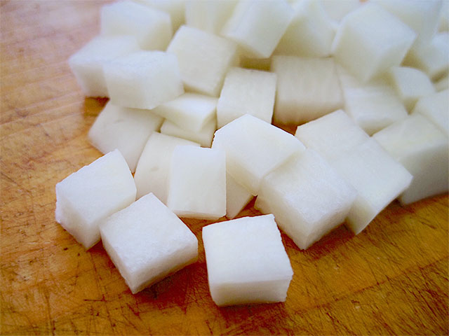 1.大根を1cm角程のサイコロ状にカットします。