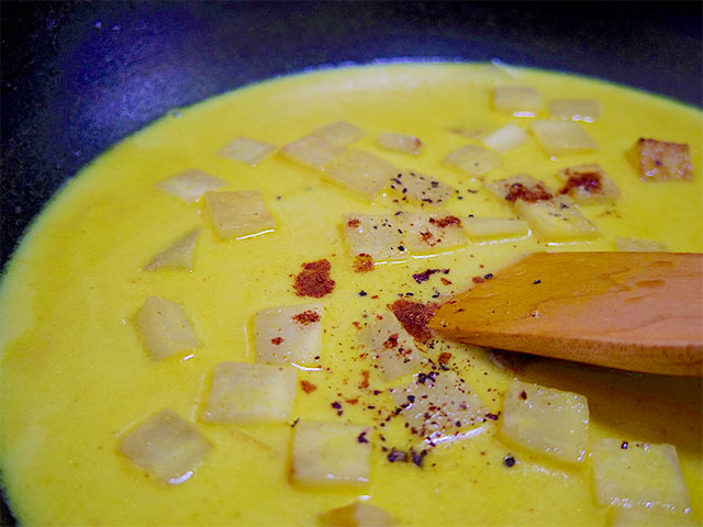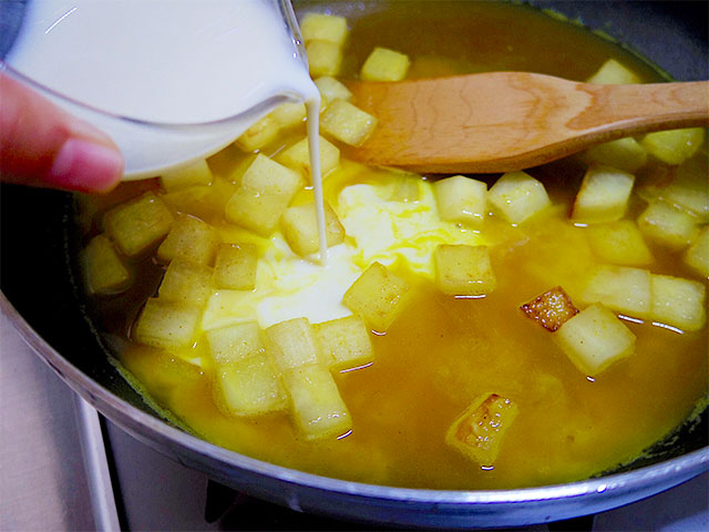 4.カレー粉と豆乳を加えて、沸騰させないようにひと煮立ちさせます。