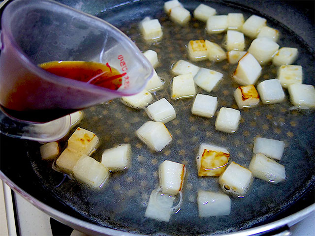 3.大根に焼き目がついてきたら、水とうどんだしの素を入れ10分程煮ます。